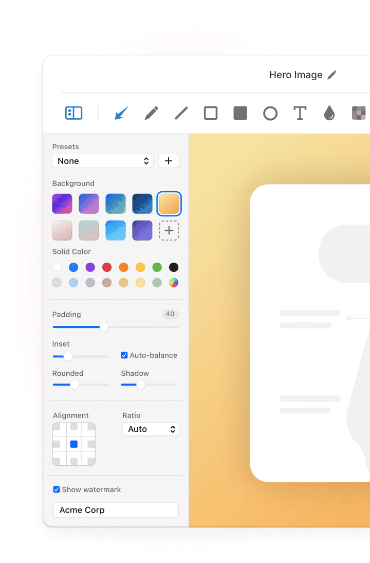 Choose how your screenshot appears over your background with an array of powerful customization options.